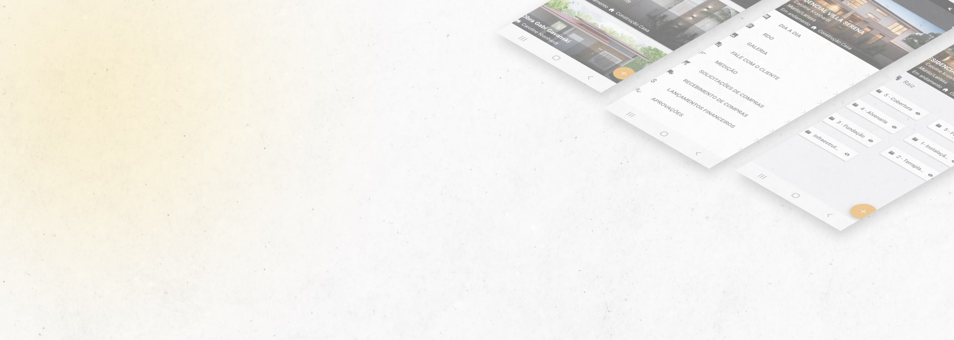 Com o app, você consegue acompanhar o progresso da sua obra, fazer pedidos de compra, receber materiais, fazer pré-lançamentos financeiros, adicionar fotos à galeria e organizá-las em pastas, comunicar-se com seus clientes e realizar medições físicas para rastrear os custos de execução.